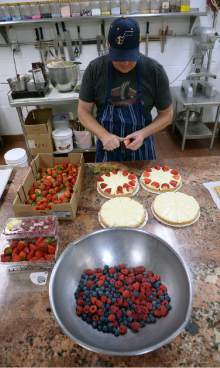 While the desserts are usually started one or two days in advance, game day is when most of the real action happens. Perham's professional kitchen in an industrial area of South Salt Lake is buzzing by 8 a.m. as cakes and tarts are frosted, topped with fruit, cut, boxed and put into the company van. By 10 a.m., all that's left to do is deliver the goods to Vivint Smart Home Arena.