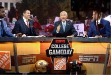 ESPN College Gameday cast, Desmond Howard, Rece Dav is, Lee Corso, and Kirk Herbstre
