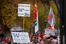 Utah fans playfully heckle Washington fans during the broadcast of ESPN's College Gameday at President's Circle on the University of Utah campus, Saturday, October 29, 2016.