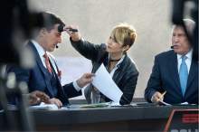 ESPN stage manager Trish Jelle applies some makeup to the face of ESPN analyst Rece