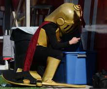 The Lone Peak Knight takes time out to check his phone during the 5A semifinal football game against American Fork at Rice-Eccles Stadium on the University of Utah campus in Salt Lake City Thursday November 10, 2016.