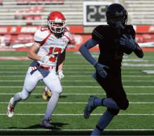 American Fork's Logan Johnson chases down Lone Peak's Tyler Macpherson bobbles a pass duri