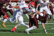 Lone Peak quarterback Dakota Hansen tries to escape the pressure from American Fork's Brandon Bowen during the 5A semifinal football game at Rice-Eccles Stadium on the University of Utah campus in Salt Lake City Thursday November 10, 2016.