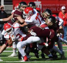 American Fork's Christian Snowden gets brought down by the Lone Peak defense during the 5A semifinal football game at Rice-Eccles Stadium on the University of Utah campus in Salt Lake City Thursday November 10, 2016.