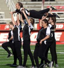 The American Fork drill team performs during halftime of the 5A semifinal football game between Lone Peak and American Fork at Rice-Eccles Stadium on the University of Utah campus in Salt Lake City Thursday November 10, 2016.