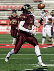 Lone Peak's Tyler Macpherson bobbles a pass during the 5A semifinal football game against