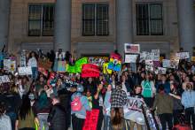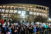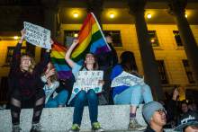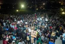 The protest began about 7 p.m. The crowd marched the streets of downtown closing down traffic on each one in the dark before they ended at the Capitol with cries of "Racist, sexist, anti-gay, Donald Trump go away."