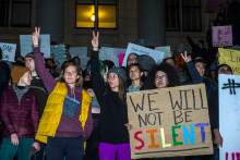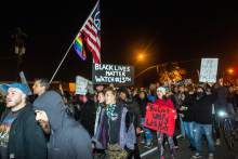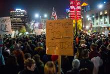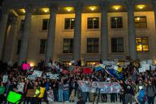 Romero pleaded with the crowd to fight for equality and inclusion during the Republican's presidency. Then the crowd marched away along State Street, wrapping around the City-County Building and the downtown library. The group got so large at times that the front would chant something different from the tail end. A few candles illuminated faces as protesters walked.