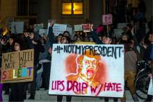 Protesters started at the Bennett Federal Building, 125 S. State St., where pictures of President Barack Obama and Vice President Joe Biden hung inside the front doors. They decried Obama's replacement with posters calling Trump a fascist. Many banners read: "Not my president."