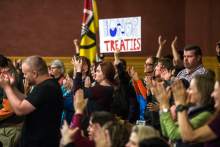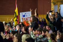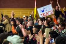 Dakota Access Pipeline protestors cheer after the Salt Lake City Council adopts a joint resolution with Mayor Jackie Biskupski supporting the Standing Rock Sioux Tribe's opposition to the Dakota Access Pipeline Tuesday November 15, 2016.