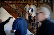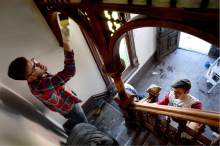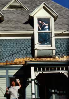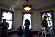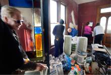 Upstairs, as she razor-bladed paint from a window framed with rainbow panels of red, yellow, blue and purple glass, volunteer Jess Mikel was brought to tears by the view.