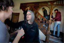Inside the front entry, BYU law professor Kif Augustine-Adams was on a step ladder, sanding the house's wood trim to get it ready for fresh staining.