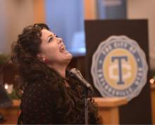 Taylorsville Arts Council performer Sara McDonald sings out a show tune to Salt Lake County and Taylorsville City officials Monday Dec. 5 after announcement of a new Mid-Valley Performing Arts Center that will be built just to the southeast of Taylorsville City Hall at 5600 S. and 2600 W. She sings in the Taylorsville City Council chambers where the group usually practices.