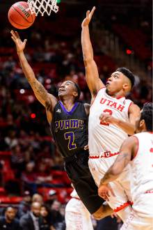 Prairie View A&M Panthers guard Avery Lomax (2) puts up a shot ahead of Utah Utes guard Sedrick Barefield (2) as University of Utah hosts Prairie View A&M, NCAA basketball at the Huntsman Center in Salt Lake City, Saturday December 17, 2016.