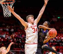 Utah Utes forward Jayce Johnson (34) blocks a shot by Prairie View A&M Panthers guard A