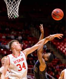 Utah Utes forward Jayce Johnson (34) shoots as University of Utah hosts Prairie View A&M, NCAA basketball at the Huntsman Center in Salt Lake City, Saturday December 17, 2016.