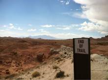 A sign marks the end of the Curtis Bench Trail in Goblin Valley State Park. The trail concludes with a view of Goblins on the valley below and the Henry Mountains in the distance.
