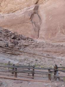 A fence and sign announce the presence of petroglyphs in Black Dragon Canyon on Sept. 12,