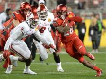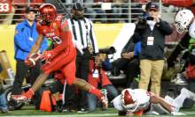 Utah Utes running back Joe Williams (28) stretches for a touchdown during the Foster Farms