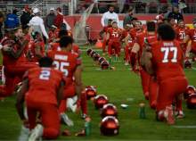The Utah Utes and Indiana Hoosiers warm up prior to the start of the Foster Farms Bowl at