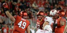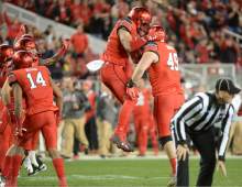Utah Utes defensive end Hunter Dimick (49) gets mobbed after recovering a fumble after Uta