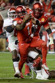 Utah Utes quarterback Tyler Huntley (1) celebrates his touchdown run during the Foster Farms Bowl at Levi's Stadium in Santa Clara California Wednesday December 28, 2016.