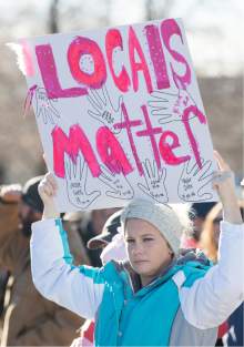 Lacey held a "Locals Matter" sign with handprints traced and signed by seven of her nieces. All grew up on ranches, she said.