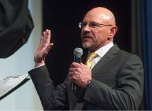 Millcreek City's first mayor Jeff Silvestrini, above, and city council members; Sylvia Catten, Dwight Marchant, Cheri Jackson and Bev Uipi recited their oaths of office at a ceremony kicking off a celebration of the community becoming the 17th city in Salt Lake County, Tuesday, January 4, 2017 at Wasatch Junior High.
