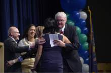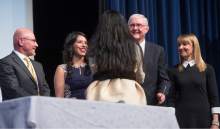 Millcreek City's first mayor Jeff Silvestrini and city council members; Sylvia Catten, Dwight Marchant, Cheri Jackson and Bev Uipi, (center) recited their oaths of office at a ceremony kicking off a celebration of the community becoming the 17th city in Salt Lake County, Tuesday, January 4, 2017 at Wasatch Junior High.