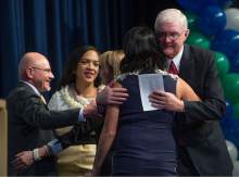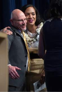 Millcreek city council member Cheri Jackson, right, shares a laugh with Patrice Arent, left, who swore Jackson into office. Millcreek City's first mayor Jeff Silvestrini and city council members; Sylvia Catten, Dwight Marchant, Cheri Jackson and Bev Uipi recited their oaths of office at a ceremony kicking off a celebration of the community becoming the 17th city in Salt Lake County, Tuesday, January 4, 2017 at Wasatch Junior High.