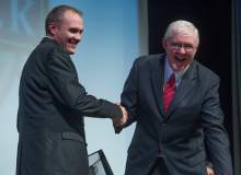 Millcreek council member Dwight Marchant laughs after flubbing the words of his oath spoken first by Greg Marchant, left. Millcreek City's first mayor Jeff Silvestrini and city council members; Sylvia Catten, Dwight Marchant, Cheri Jackson and Bev Uipi recited their oaths of office at a ceremony kicking off a celebration of the community becoming the 17th city in Salt Lake County, Tuesday, January 4, 2017 at Wasatch Junior High.