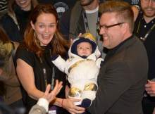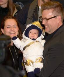 In the idealistic spirit of the film, executive producer Alexandra Johnes posed with her 7-week-old, Quinn, who was dressed in his own white spacesuit.