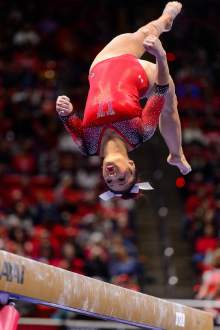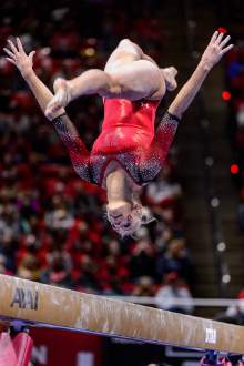 • In her first meet back since tearing her Achilles tendon almost a year ago, sophomore Kari Lee has a bobble on the balance beam but recovers enough to score 9.8.