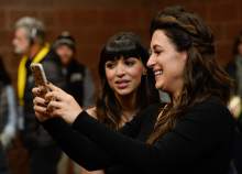 Hannah Simone, left, and Angelique Cabral take a selfie as they attend the premiere of "Band Aid," at the Eccles Theatre as part of 2017 Sundance Film Festival in Park City on Tuesday, Jan. 24, 2017.