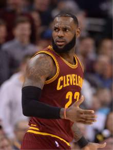Cleveland Cavaliers forward LeBron James (23) looks back at his teammates after they gave u