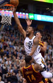Utah Jazz forward Derrick Favors (15) gets to the basket over the top of Cleveland Cavalier