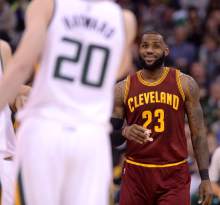 Cleveland Cavaliers forward LeBron James (23) smiles at Utah Jazz forward Gordon Hayward (2