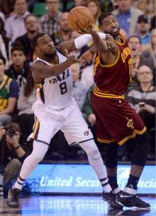 Utah Jazz guard Shelvin Mack (8) and Cleveland Cavaliers center Tristan Thompson (13) reach