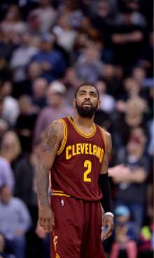 Cleveland Cavaliers guard Kyrie Irving (2) looks up at the scoreboard as the Jazz defeat the Cavaliers at Vivint Smart Home Arena in Salt Lake City Tuesday January 10, 2017.