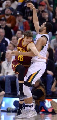 Cleveland Cavaliers guard Kyle Korver (26) crashes into Utah Jazz forward Trey Lyles (41) f