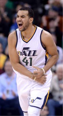 Utah Jazz forward Trey Lyles (41) screams with excitement after nailing a three-pointer late in the fourth quarter extending the Jazz lead during the Utah Jazz versus Cleveland Cavaliers NBA basketball game at Vivint Smart Home Arena in Salt Lake City Tuesday January 10, 2017.