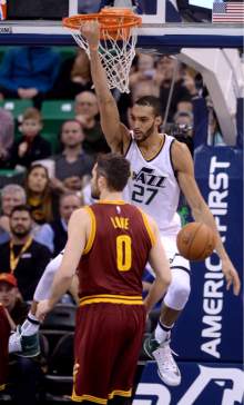 Utah Jazz center Rudy Gobert (27) hangs on the rim after slamming the ball for two during the Utah Jazz versus Cleveland Cavaliers NBA basketball game at Vivint Smart Home Arena in Salt Lake City Tuesday January 10, 2017.