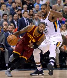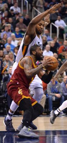 Cleveland Cavaliers guard Kyrie Irving (2) can't get a shot off as Utah Jazz forward Derri