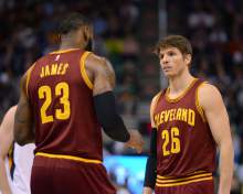 Cleveland Cavaliers forward LeBron James (23) talks with Cleveland Cavaliers guard Kyle Kor
