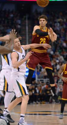 Cleveland Cavaliers guard Kyle Korver (26) fires a pass to the baseline during the Utah Jaz
