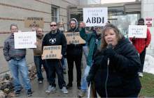 Outside the building where the hearing was held, at least 10 people were protesting, carrying signs and shouting for the release of the records.