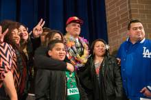 Wearing a Los Angeles Dodgers pullover, Line was able to attend the ceremony. His heath is on the rise, though he's still recovering.
