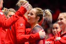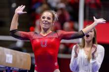 MyKayla Skinner celebrates her 9.9 floor routine as the University of Utah hosts Michigan,