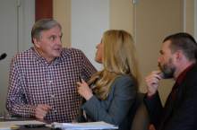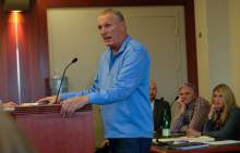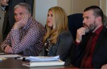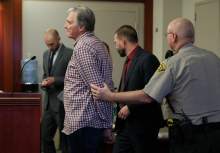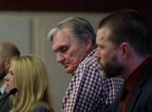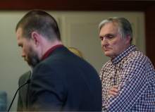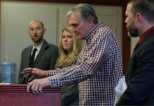 Joseph Sherm who lost 150,000 when he invested with admitted fraudster Dee Randall, second from right, speaks in support of jail time at the Matheson Courthouse during sentencing by 3rd District Judge Mark Kouris on Monday, Feb. 6, 2017. Randall pleaded guilty in July of last year to five charges related to his operation of a Ponzi scheme that took in more than $72 million from about 700 people.