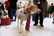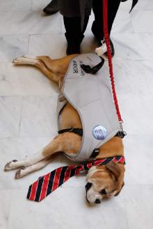 One service dog with the group even wore a tie naturally with both red and blue stripes, as to not offend either major party. A sign and chant by the group early in the day was, "What do we want? Change. When do we want it? Meow," instead of now.